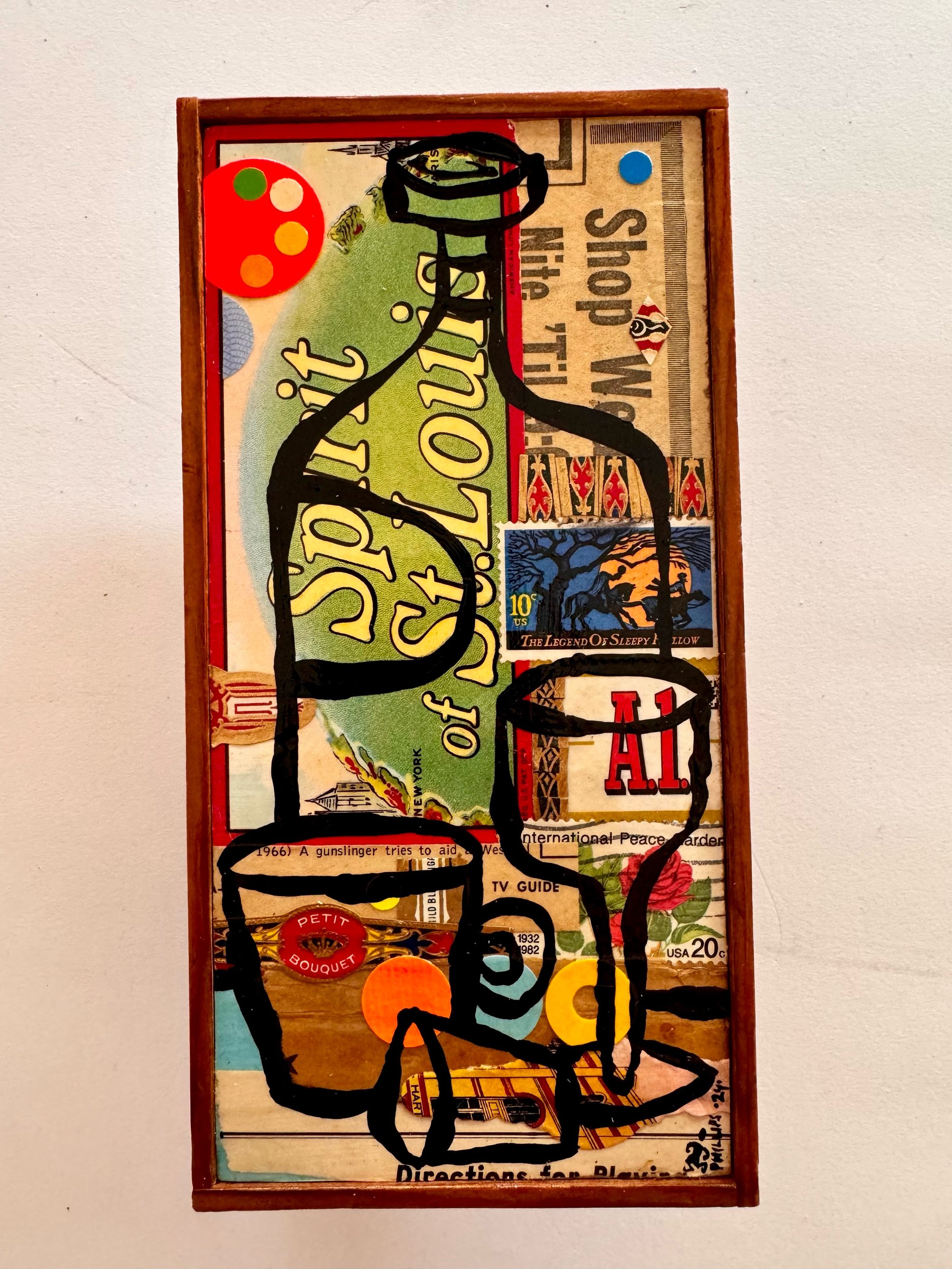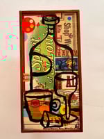 "Any Ol' Glass'll Do" - acrylic on collaged wood. Cigar labels, food labels, postage stamps, newspaper clippings. Framed with vintage yardstick. Gloss finish. 4"w x 8"t