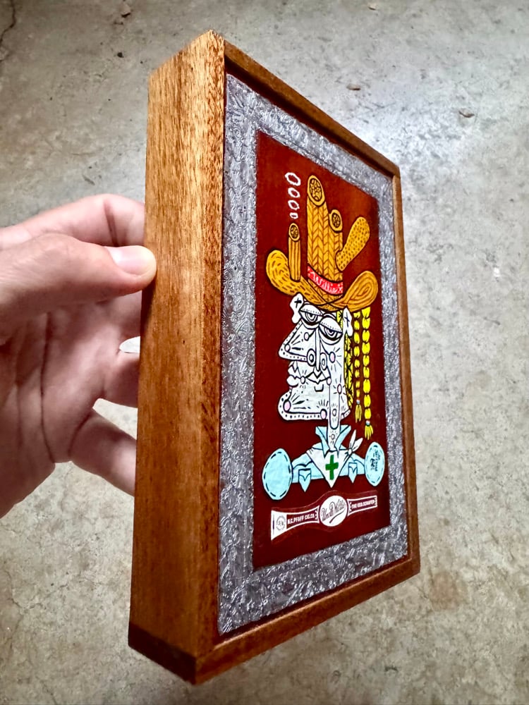 “Dr. Nelson Will See You Now” - acrylic on salvaged cherry wood with laser burned border. Collaged 100 year old “Uncle Willie” cigar band Framed with salvaged acacia wood. Gloss finish.