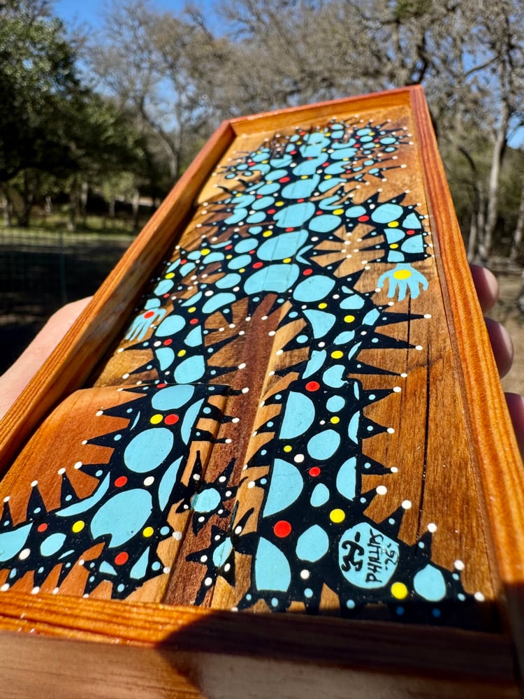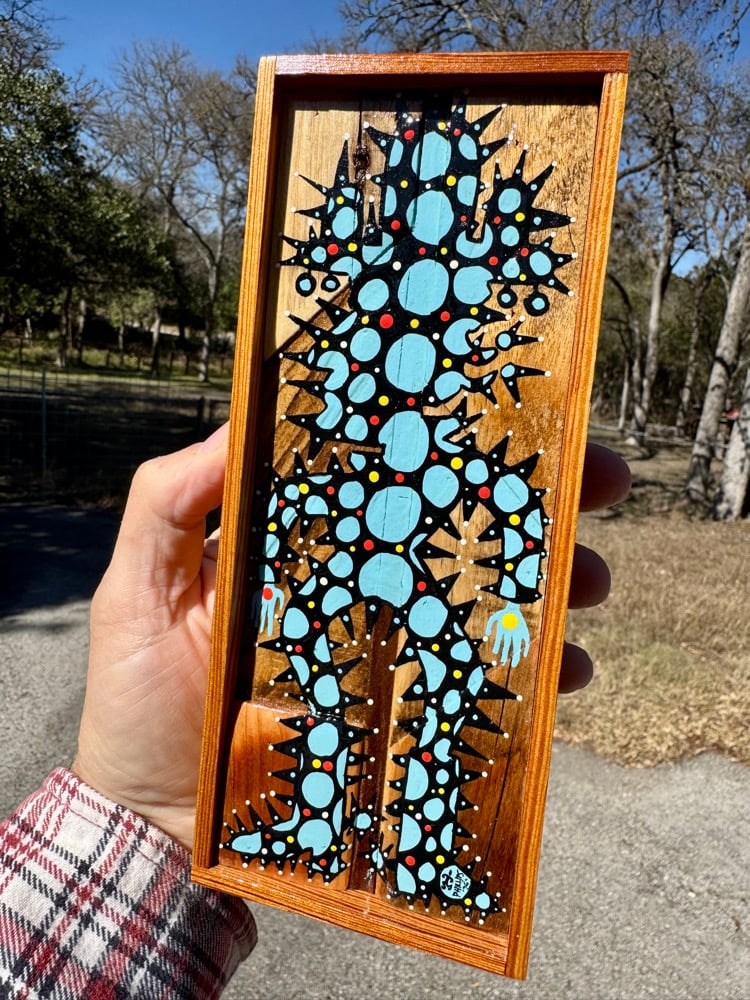 “Electric” - acrylic on salvaged wood assemblage. Framed with salvaged pine. 3.5”w x 8”t. Gloss finish. Ready to hang.