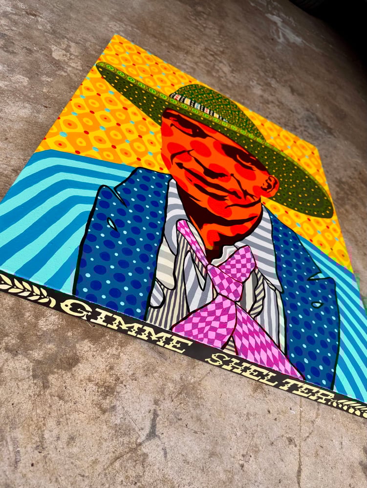 “Gimme Shelter” - acrylic on repurposed canvas. Painted sides. Gloss finish. Wire hanger installed, ready to hang. 24”w x 30”t.