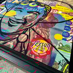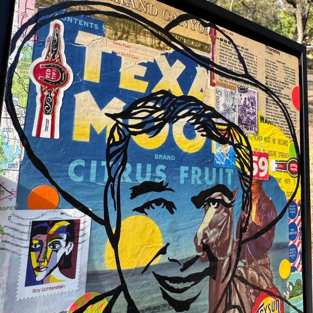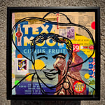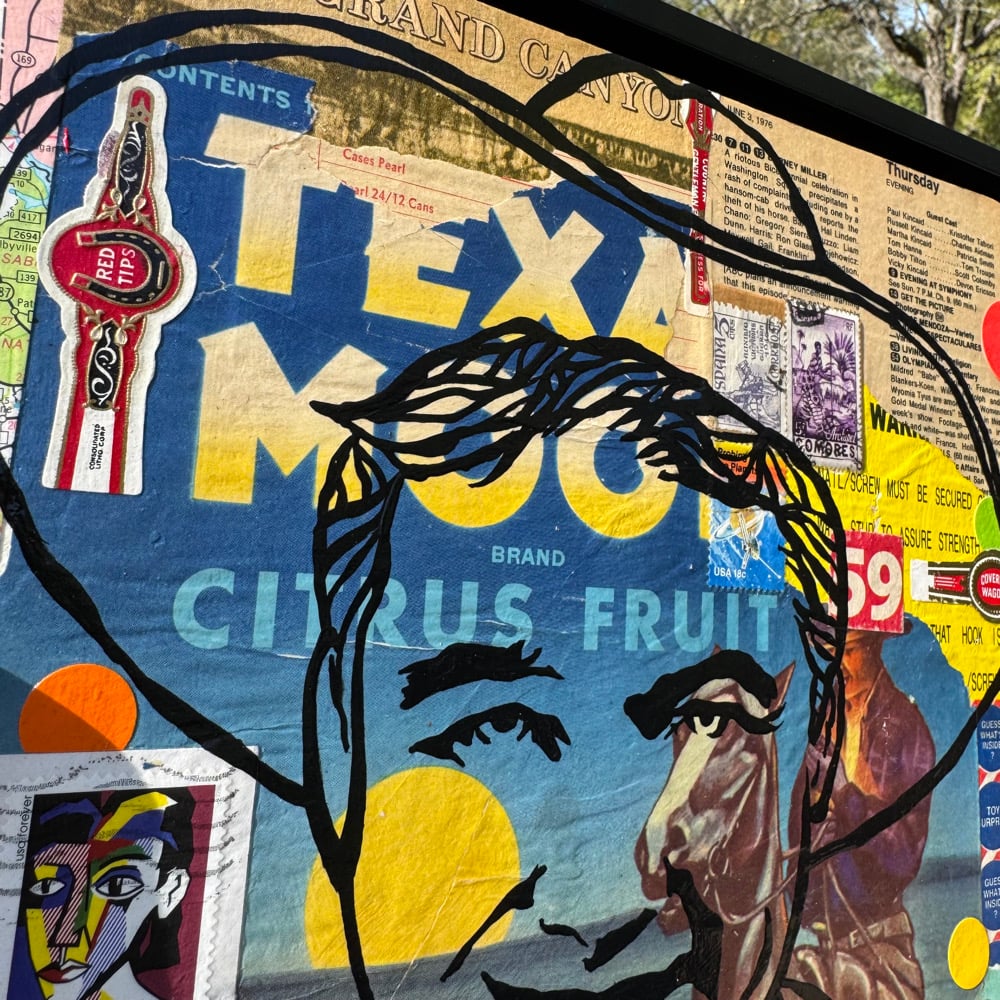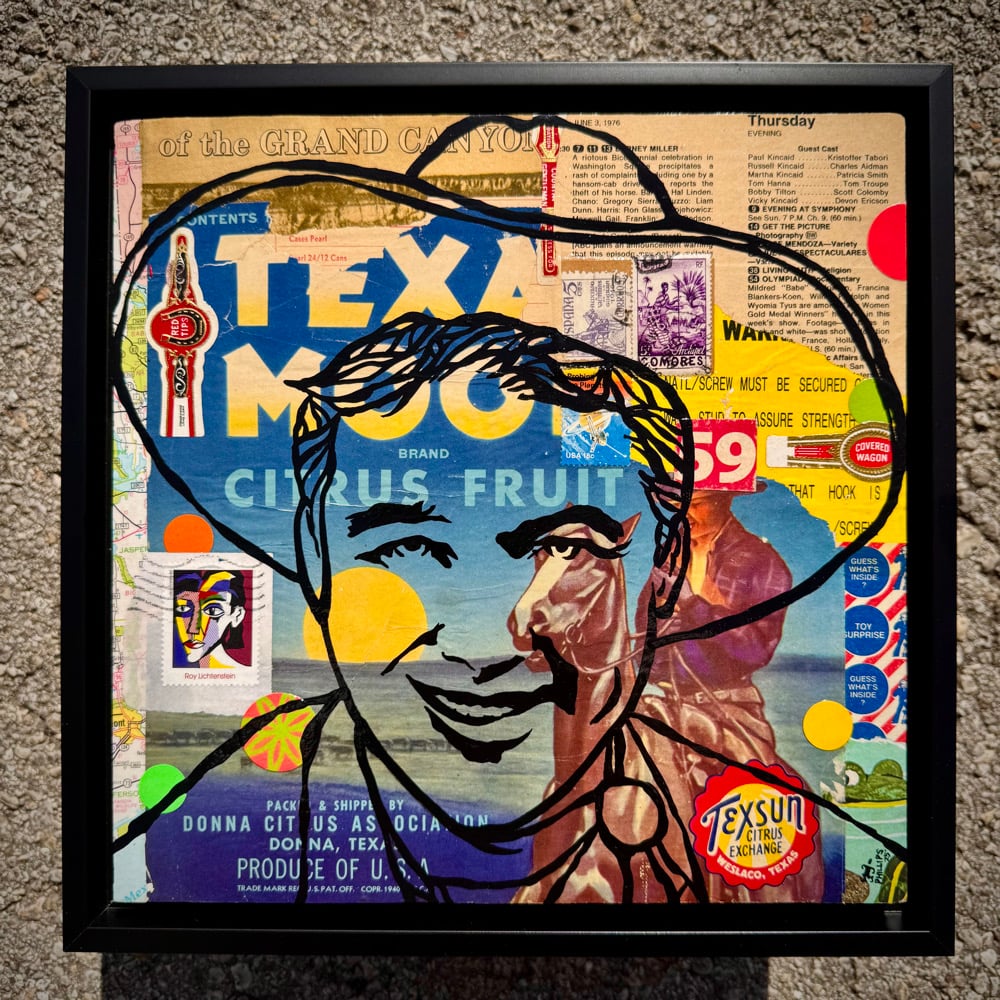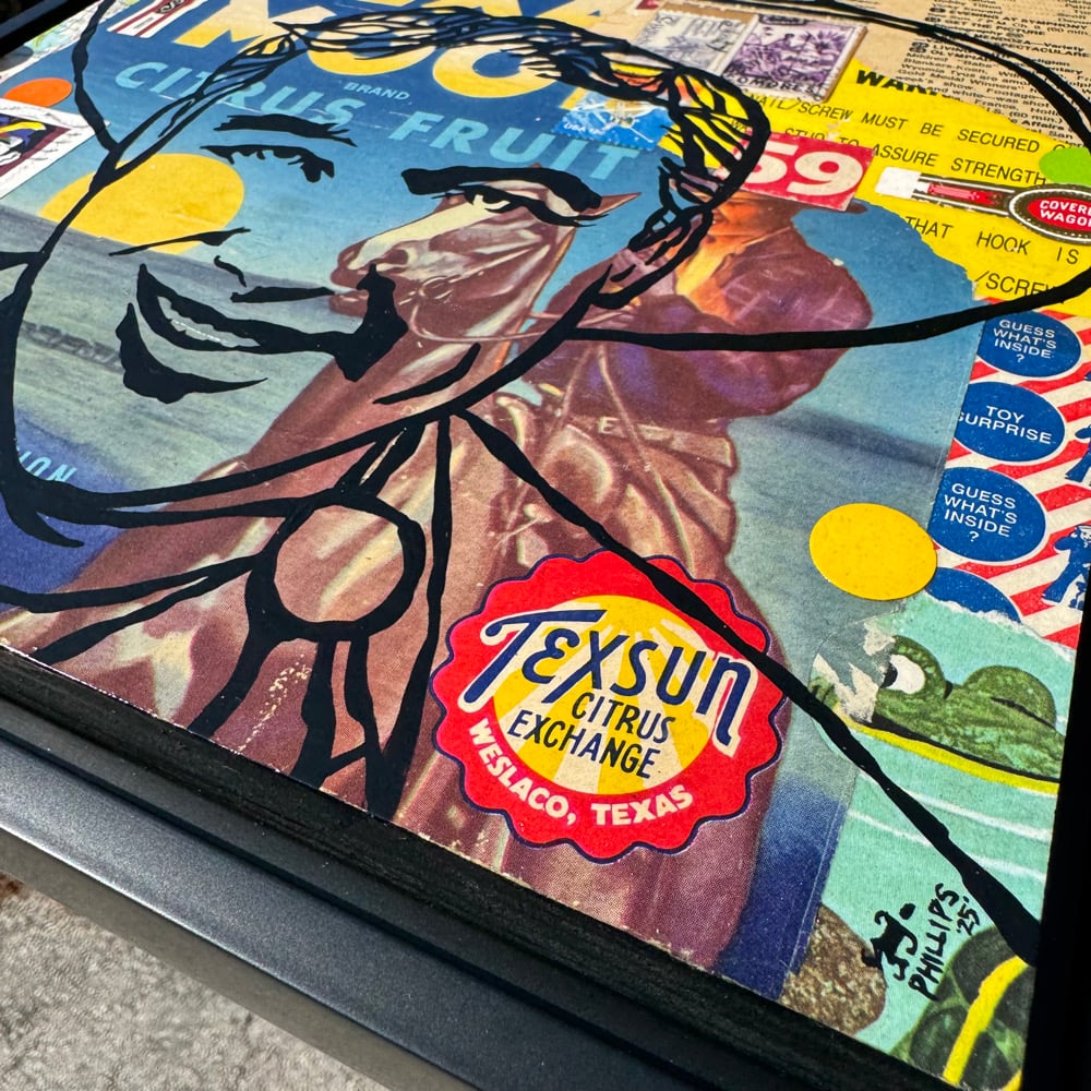 “He Goes Wherever the Crop Grows” - acrylic on collaged salvaged wood. Vintage fruit crate labels, Cracker Jack prize label, stamp, cigar band, tv guide, etc. Gloss finish for easy maintenance. 11.5”w x 11.5”t. Ready to hang.
