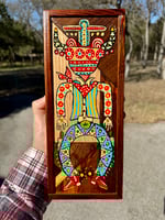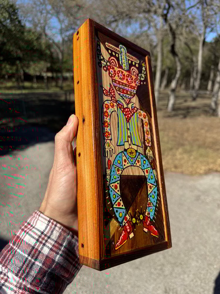 “Jasper Buckleman” - acrylic on salvaged wood assemblage. Framed with salvaged pine. All beautiful blemishes left intact. 5”w x 12”t. Gloss finish. Ready to hang.