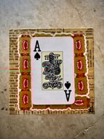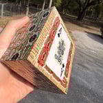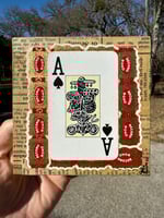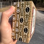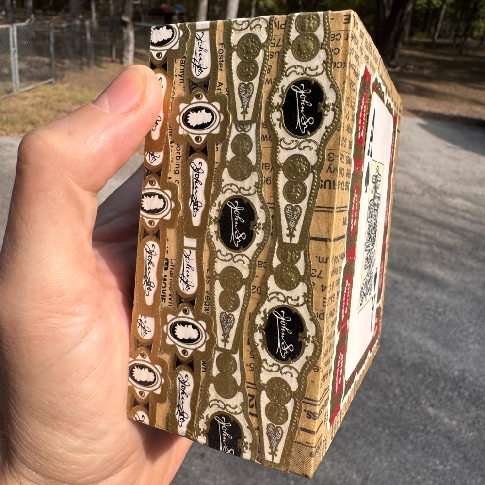 “Jr. & Sr.” - acrylic on collaged nesting box. Sides collaged with 100 year old cigar bands. 4.5” x 4.5” x 2”d