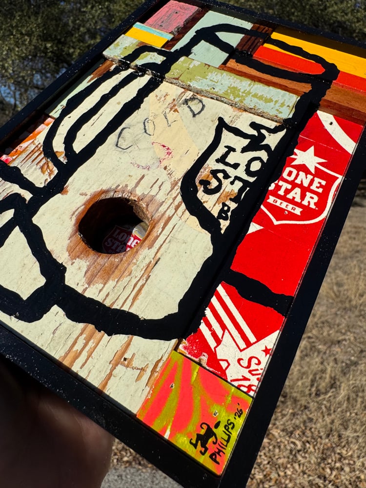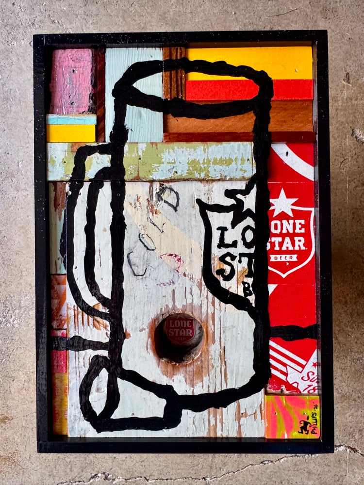 “Keep the Lone Stars Cold” - acrylic on salvaged wood assemblage. Vintage Lone Star Beer cap in hole. Gloss finish. Framed. 6”w x 8.5”t ready to hang.