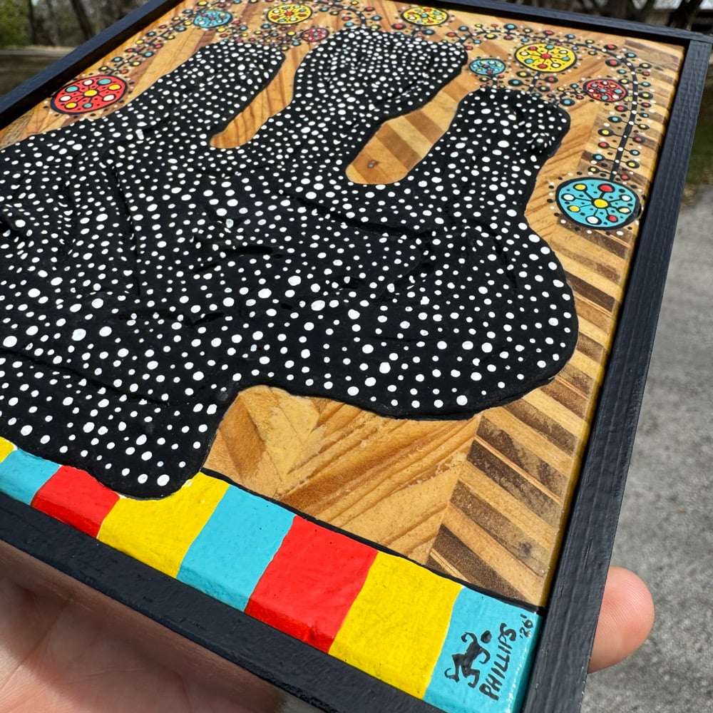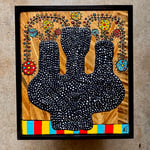 “Kusama Vase” - acrylic on textured poured mixture on salvaged plywood. Dead flat black on vase, gloss finish on rest of piece. Framed. Ready to hang. 7”w x 8”t.