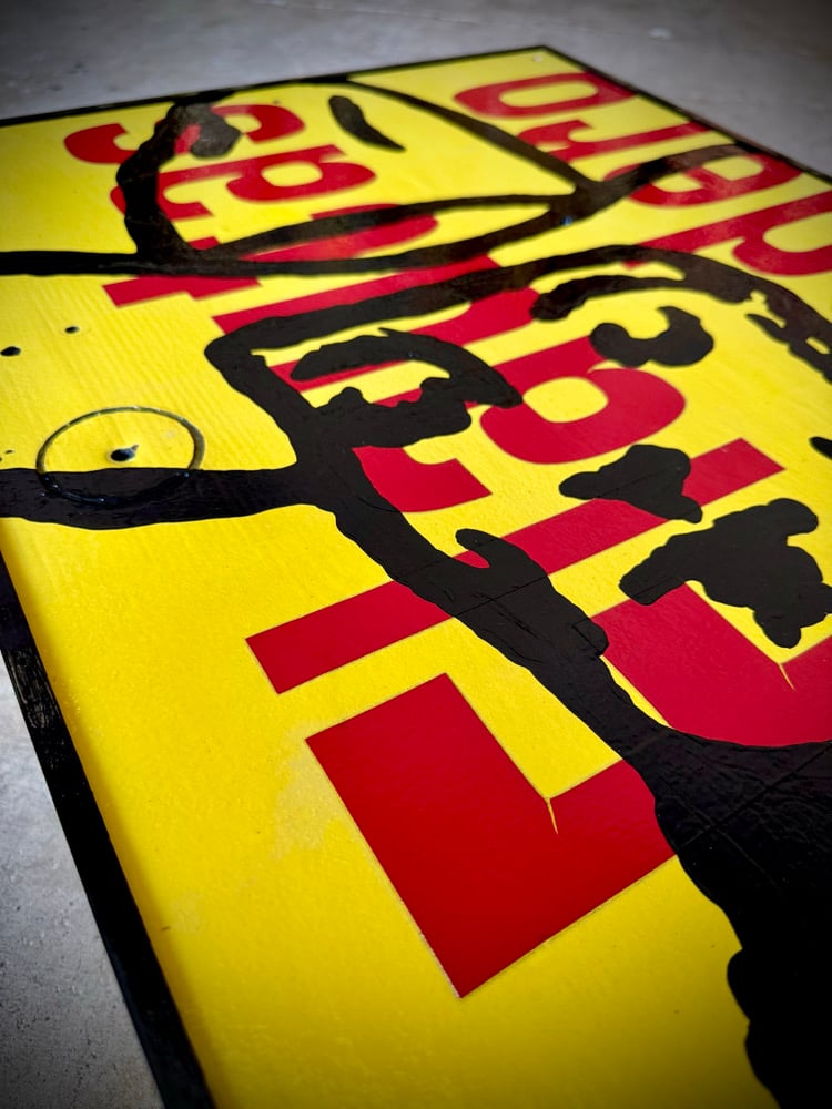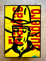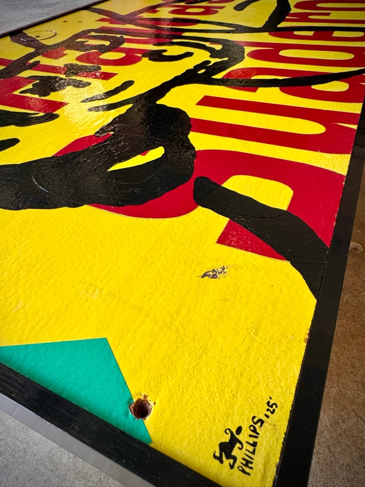 “Lunch Break Daydreaming” - found image in acrylic on salvaged road side sign from Mi Ranchito Mexican Restaurant here in Austin. Vinyl letters on plywood. Framed. Gloss finish. 20”w x 29”t Ready to hang.