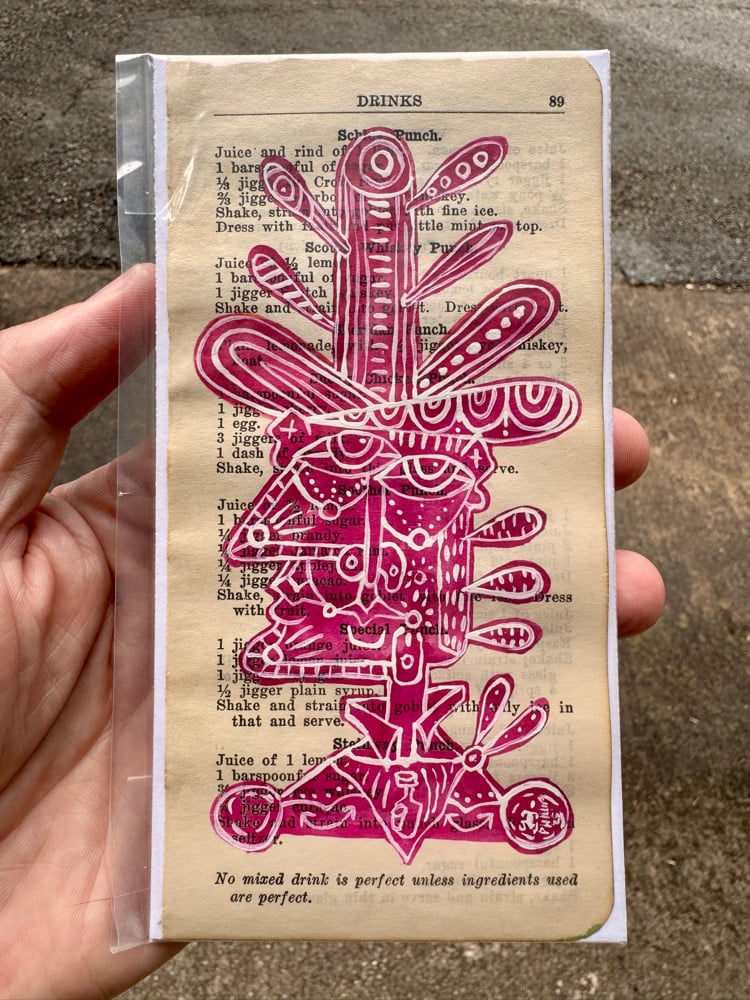 “Shake and Serve” - watercolor and acrylic on page from the book “Drinks” (1930’s?) . 3.25”w x 6.5”t. Comes in a plastic sleeve with acid free backer.