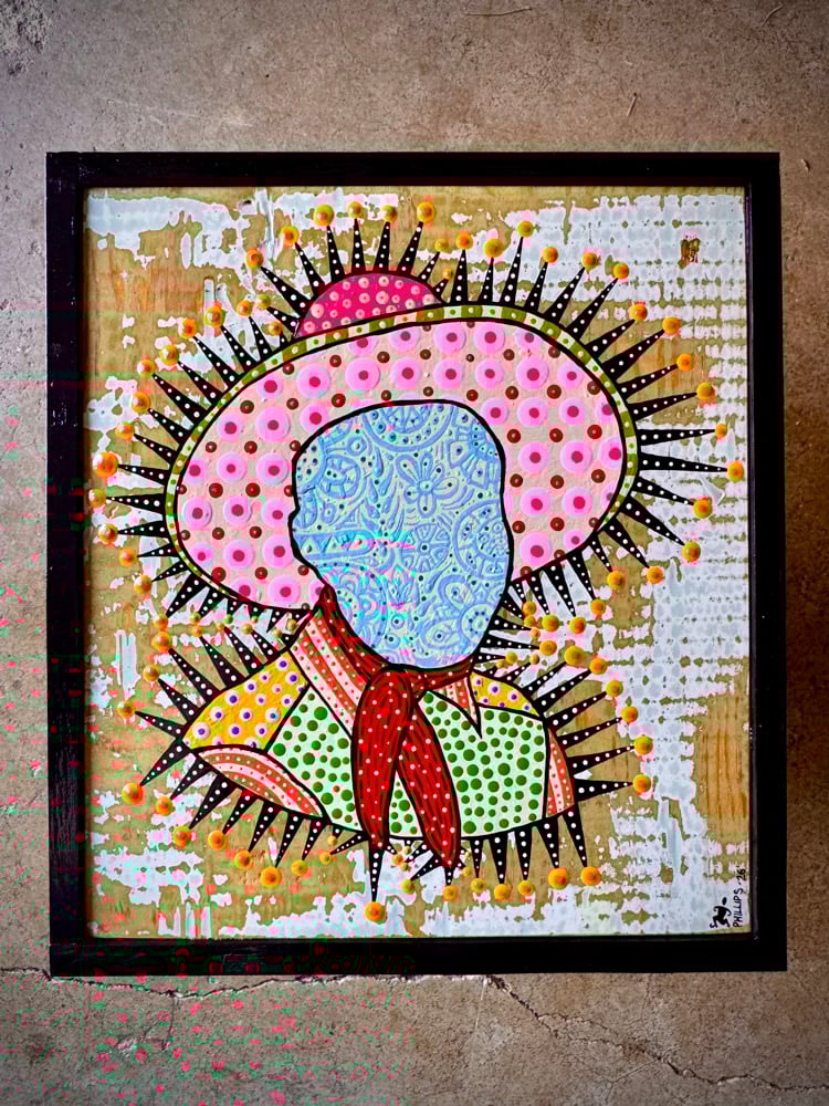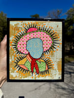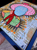 “Strange Days” - acrylic on salvaged patinad pine. Framed. Satin finish on painting, gloss finish on frame. Ready to hang. 7.5”w x 8.5”t.