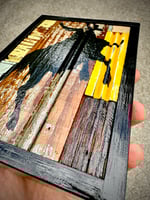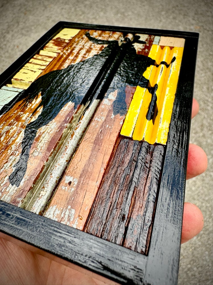“The Bull Named Buzzkill” - acrylic on salvaged bead board. Framed, ready to hang. 4”w x 6”t.