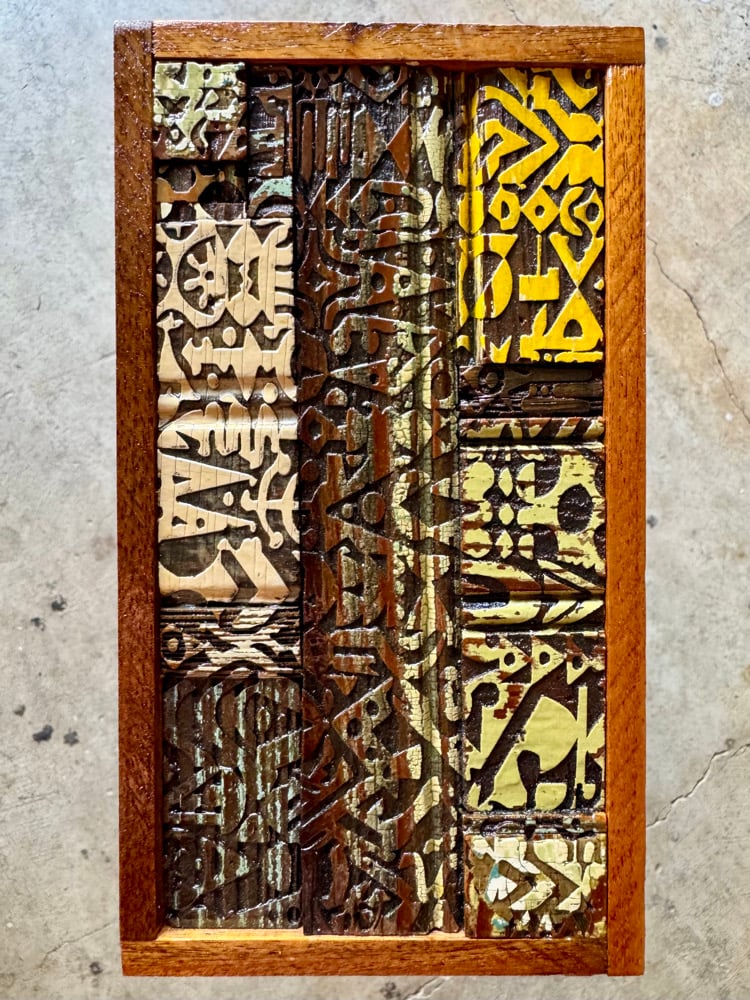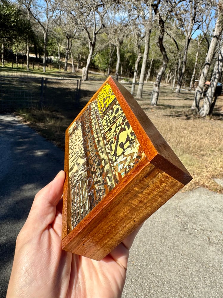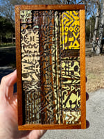 “The In Crowd” - laser burned image (my abstract work) on salvaged 100 year old bead board. Gloss finish. Framed. Ready to hang. 4”w x 7.5”t.