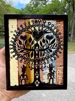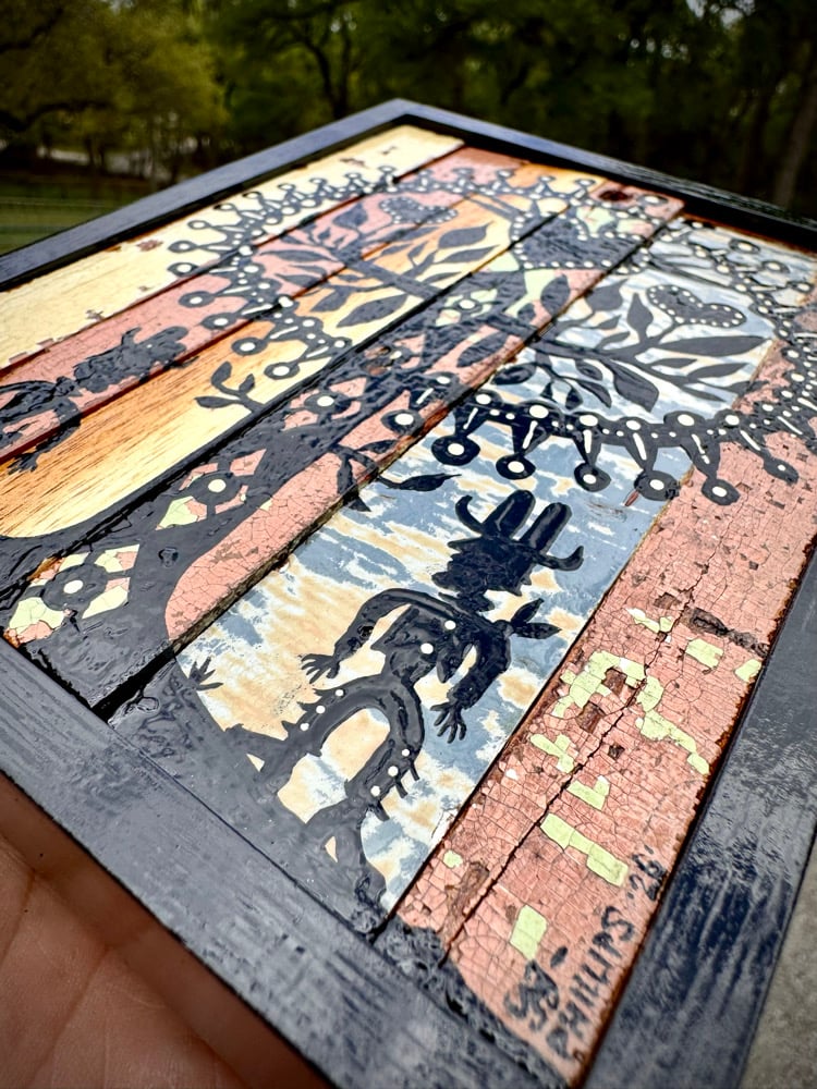 “They Danced All Night Under The Love Oak” - acrylic on salvaged wood assemblage. Framed. Gloss finish. Ready to hang. 5.5”w x 7.5”t.