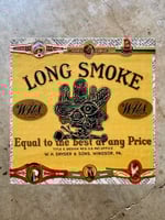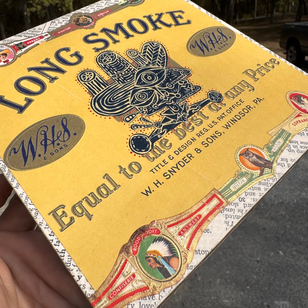 “Travelin’ Man” - acrylic on collaged nesting box. Cigar labels of misc companies. Sides collaged with 100 year old cigar bands and strips. 7” x 7” x 2.5”d.