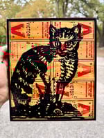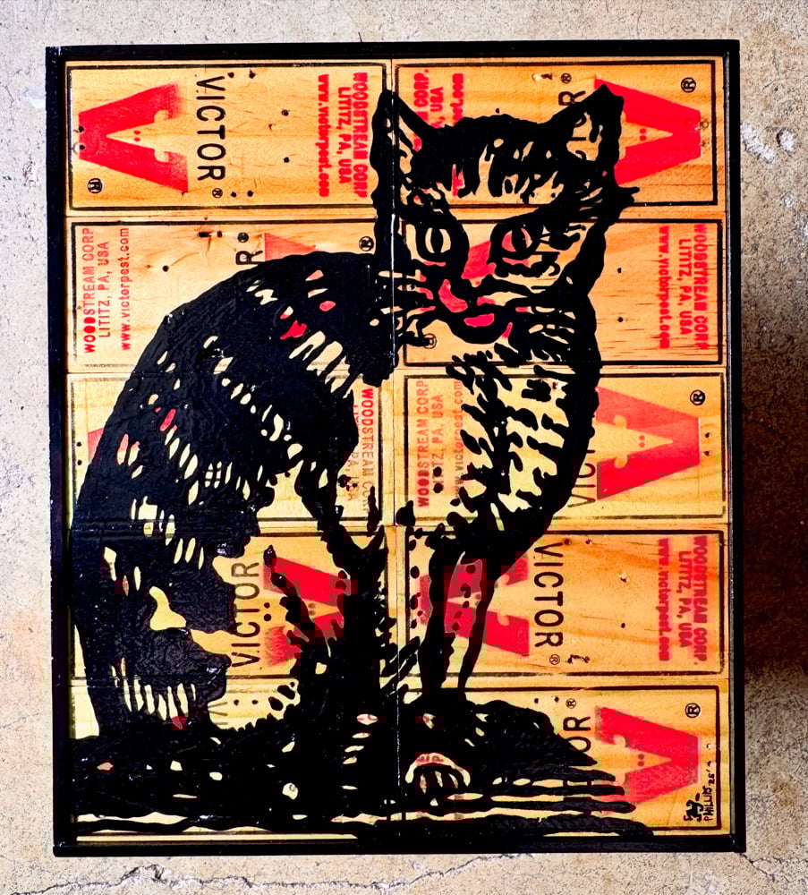 “Victor the Barn Cat” - woodcut image from the 1800’s on Victor mousetrap bases (unused). 8.25”w x 9.25”t. Framed by me. Ready to hang.