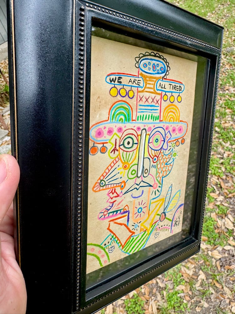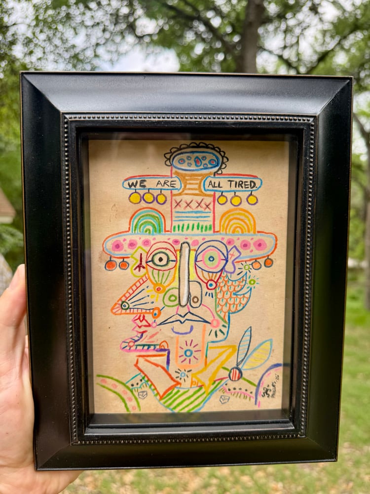 “We Are All Tired” - colored pencil on inside book cover sheet (100 years old). Framed in refurbished frame for hanging on your wall or set on yourdesk or shelf. 5”w x 7”t (artwork) 7.5”w x 9.5”t (framed)